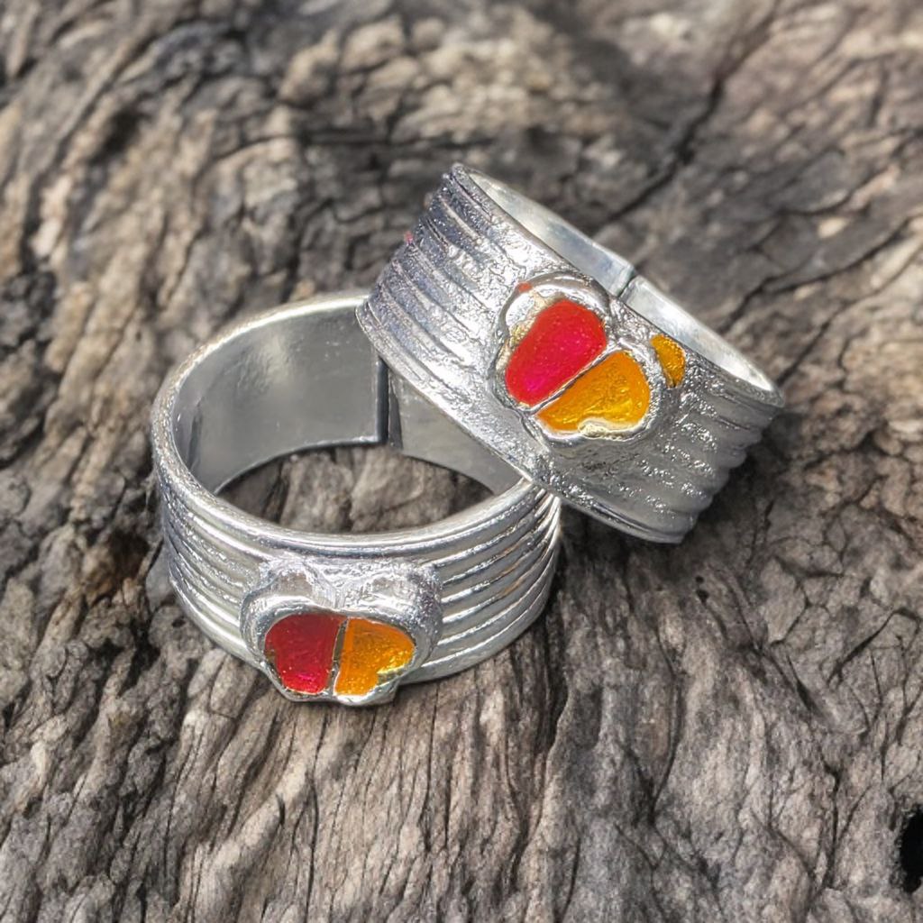 Adjustable German Silver Toe Rings Set of 2, Butterrfly Design with Red and Orange Enamel, Traditional Style
