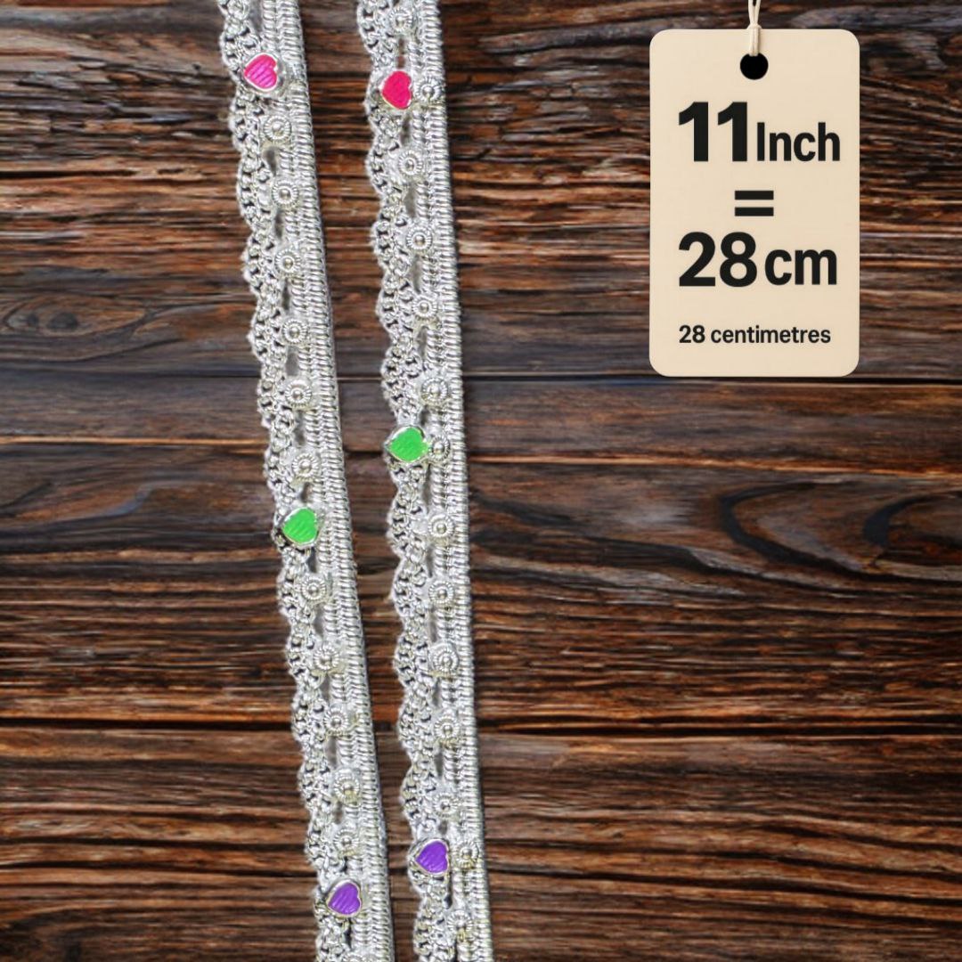 German Silver -Silver Plated Traditional Anklet with NON-Adjustable Size, Contemporary Style, Silver PLATED, 2-Piece Set-11 Inch Coloured Heart Details, Set of 2