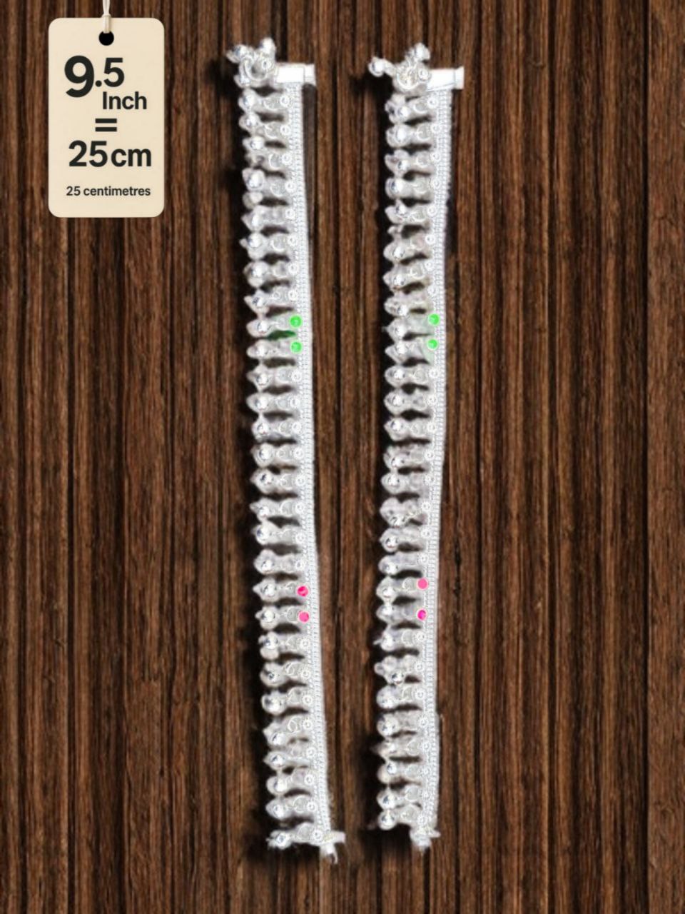 - TRADITIONAL DESIGN: German Silver anklets featuring intricate patterns with delicate dangling bells and colourful stone embellishments in red and green