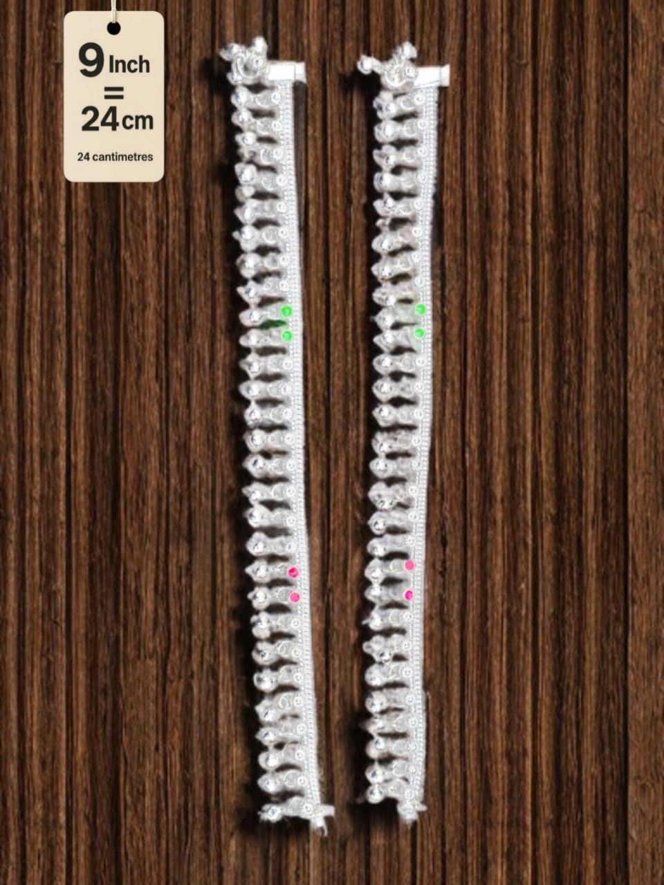 - TRADITIONAL DESIGN: German Silver anklets featuring intricate patterns with delicate dangling bells and colourful stone embellishments in red and green