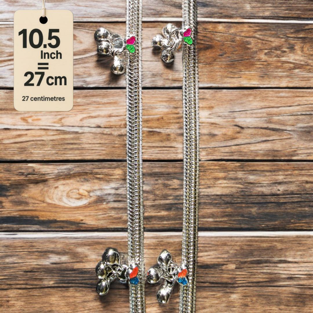 Traditional Silver-Plated Anklet Pair with Bells and Gemstone Charms, 25 cm Length, Adjustable 10 .5 Inch