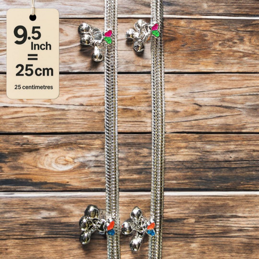 Traditional Silver-Plated Anklet Pair with Bells and Gemstone Charms, 25 cm Length, Adjustable 9.5 Inch