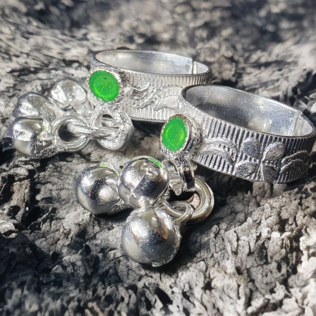 - DECORATIVE ELEMENTS: Each toe ring features a striking green stone centrepiece and multiple dangling silver bells for a melodious touch
